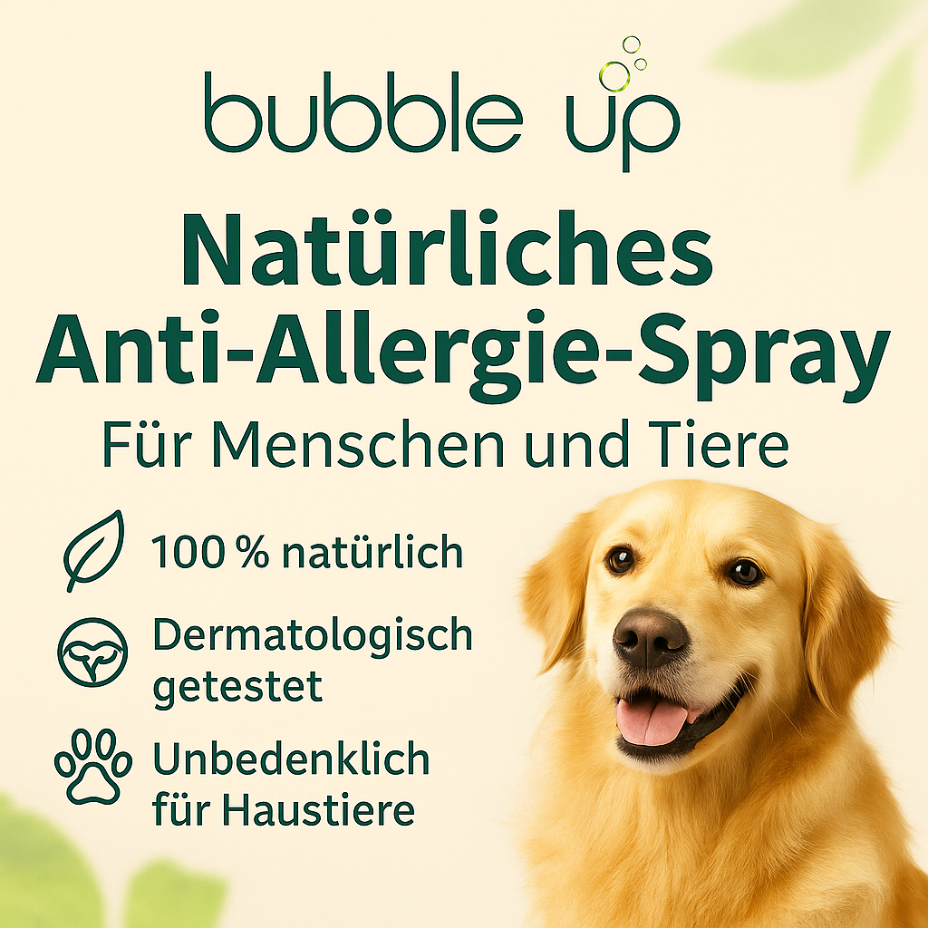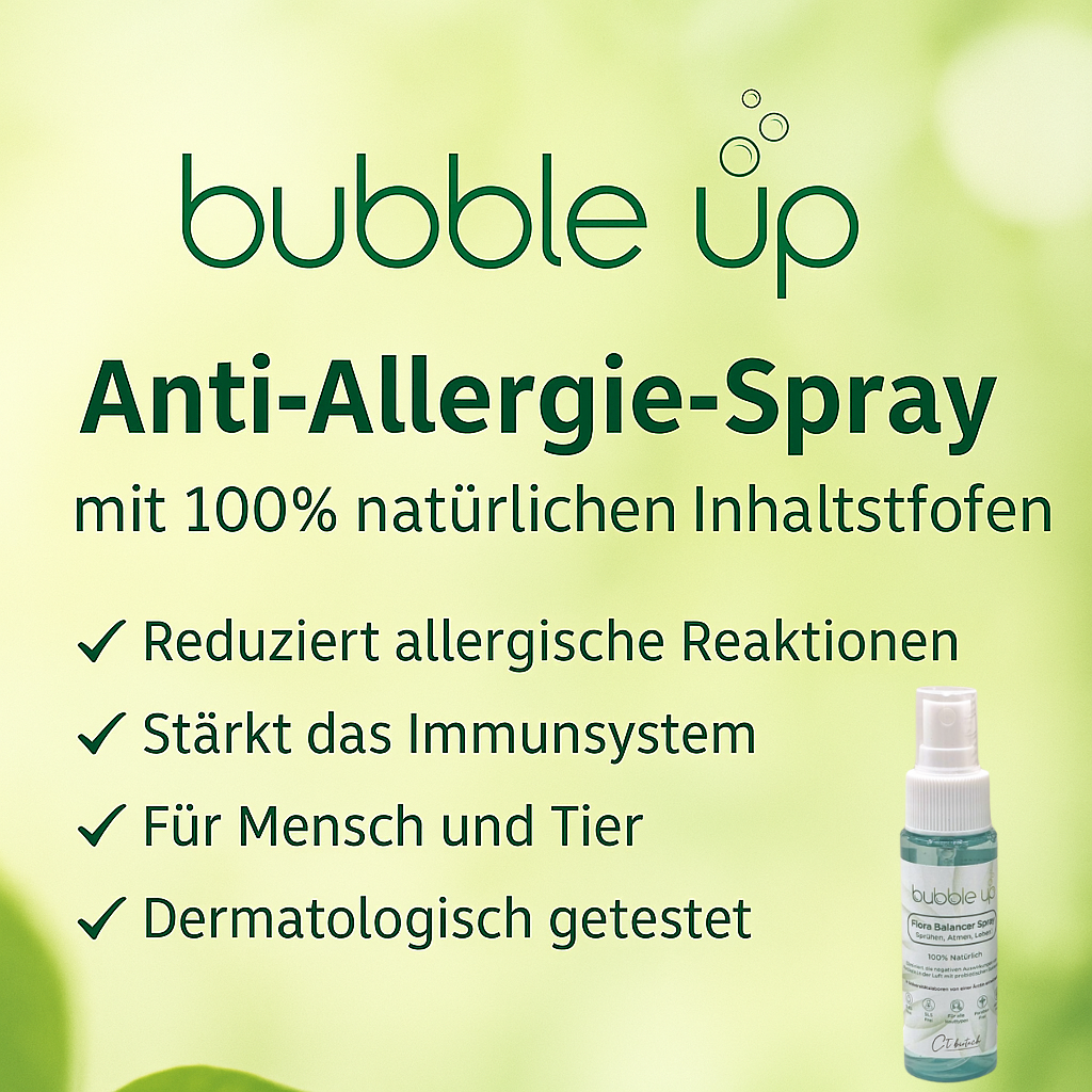 Weil du dir und deiner Umgebung etwas Gutes tun willst – ganz natürlich. Bubble Up reduziert effektiv allergieauslösende Stoffe wie Pollen, Hausstaub und Tierhaare, verbessert spürbar die Luftqualität und ist dabei 100 % unbedenklich für Mensch und Tier. Ohne Chemie, dermatologisch getestet und umweltfreundlich – für ein gesünderes Zuhause und mehr Lebensqualität.
